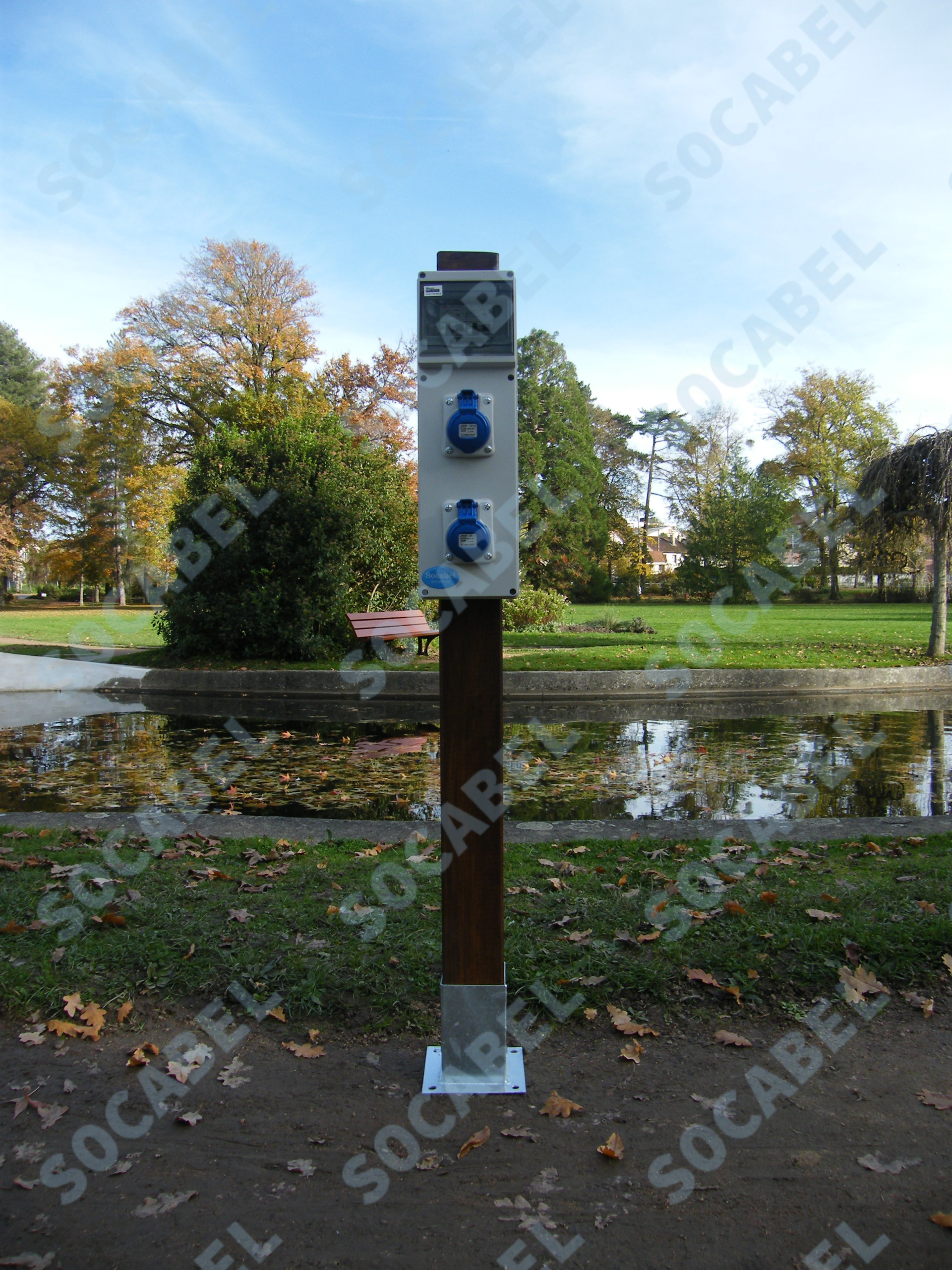 Borne Écolo Bois montée sur deux poteaux, pouvant recevoir 1 ou 2 prises, ainsi que les disjoncteurs associés.